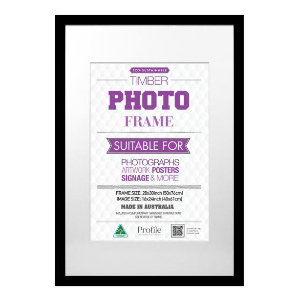 A Classic 30mm(W) x 20mm(D) solid wooden picture frame featuring a smooth matte black finish, Made in Australia using the finest quality of eco-sustainable materials.