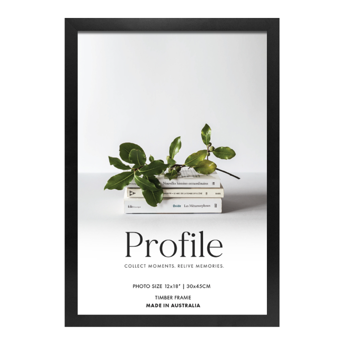 An Elegant, contemporary 20mm(W) x 20mm(D) solid wooden picture frame featuring a smooth matte black finish, Made in Australia using the finest quality of eco-sustainable materials.